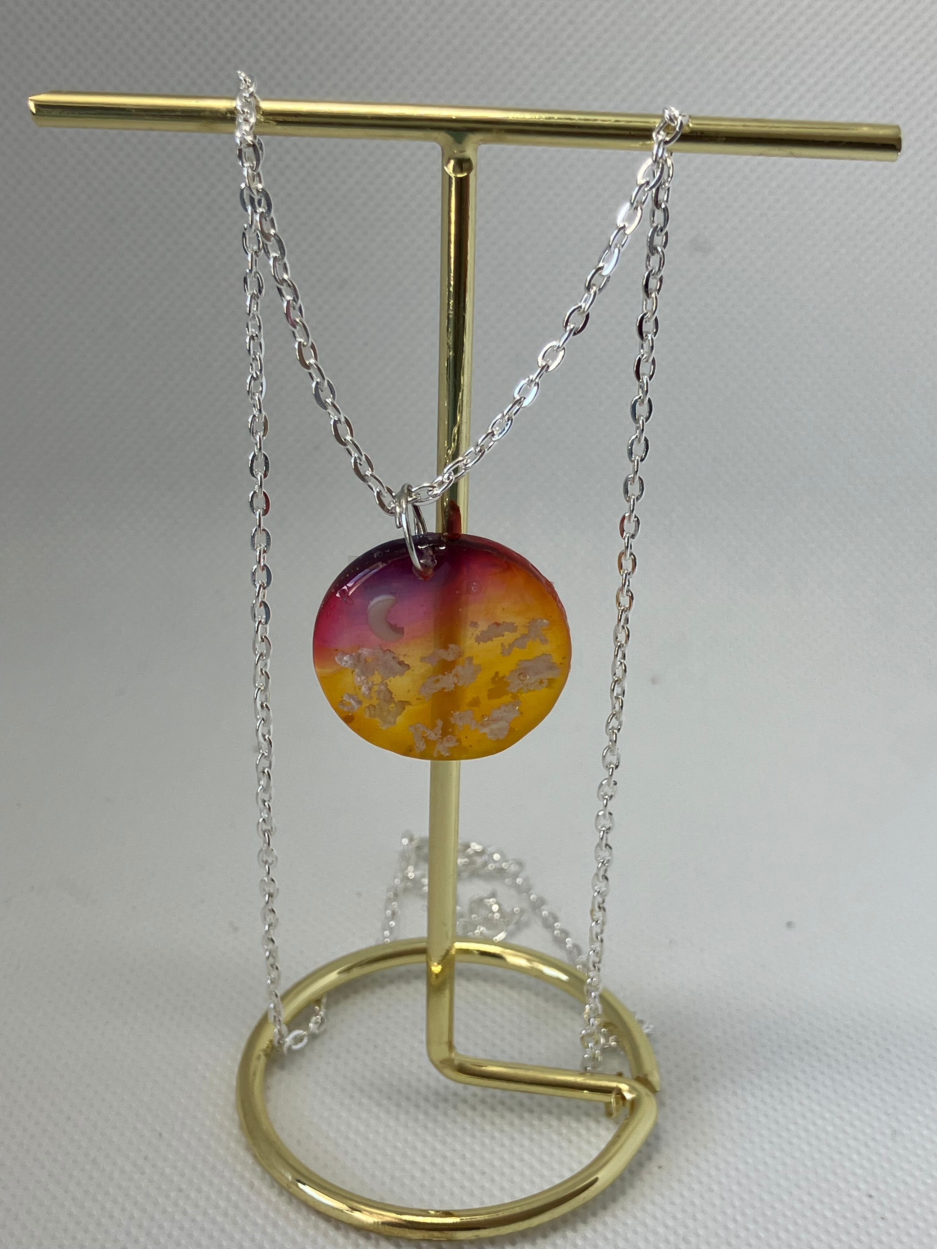 レジン ペンダントは、UVレジンを使用したクリアな光沢と美しい輝きが特徴です。手作りならではの一点もので、他にはないオリジナルアクセサリーを楽しめます。夕焼けをイメージした雲や月が閉じ込められており、見ているだけで心が躍ります。封印された月は、光に当たると光ます。職人が一つ一つ手作業で作り上げています。そのため、ひとつひとつの製作工程に心を込めることで、お客様に満足いただける逸品をお届けしています。レジン ペンダントは、あなただけの特別な存在となること間違いありません。日常使いから特別な日のアクセサリーまで、幅広いシーンで活躍してくれることでしょう。ぜひ、自分へのご褒美や大切な人へのプレゼントとしてお考えください。UVレジンは直射日光を避け、湿気のない場所に保管してください。また、長時間の水濡れや強い衝撃を与えることは避け、お手入れには柔らかい布を使用してください。ハンドメイド品のため、サイズや形に若干の個体差が生じることがあります。ご了承の上、返品はご遠慮下さい。