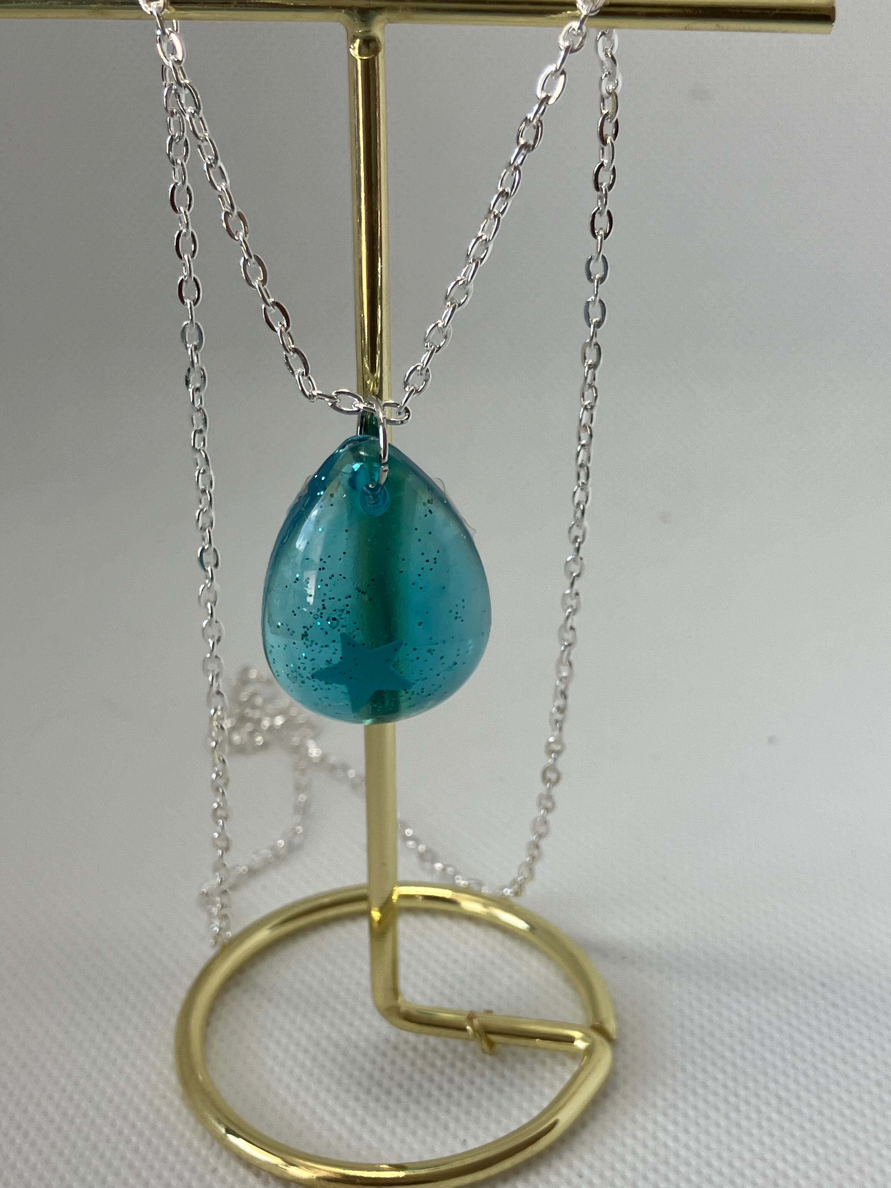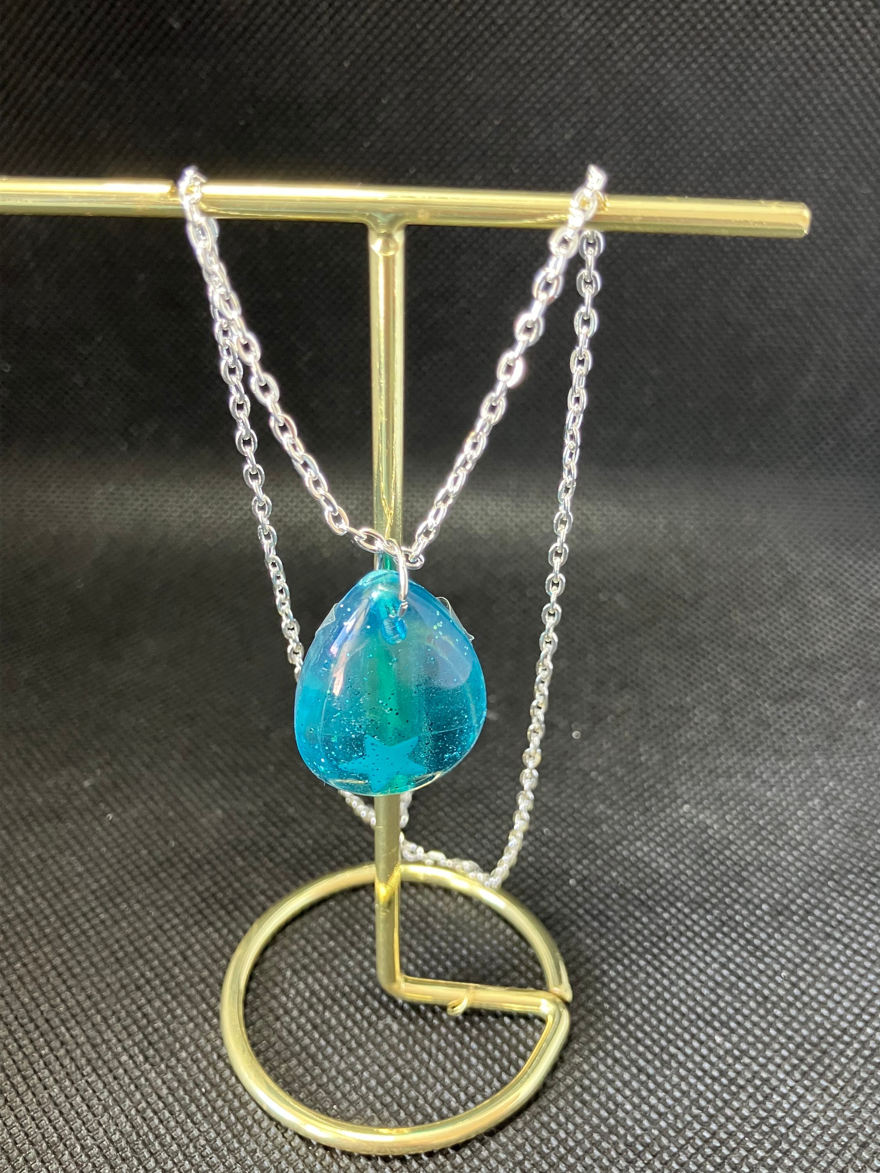 海をイメージしたUVレジンペンダントが登場しました。透明感のあるレジンに、星を閉じ込めたデザインは一点ものです。どんなコーディネートにも合わせやすく、存在感抜群のアクセサリーとして大活躍間違いなし!星は、光に当たると光ります。